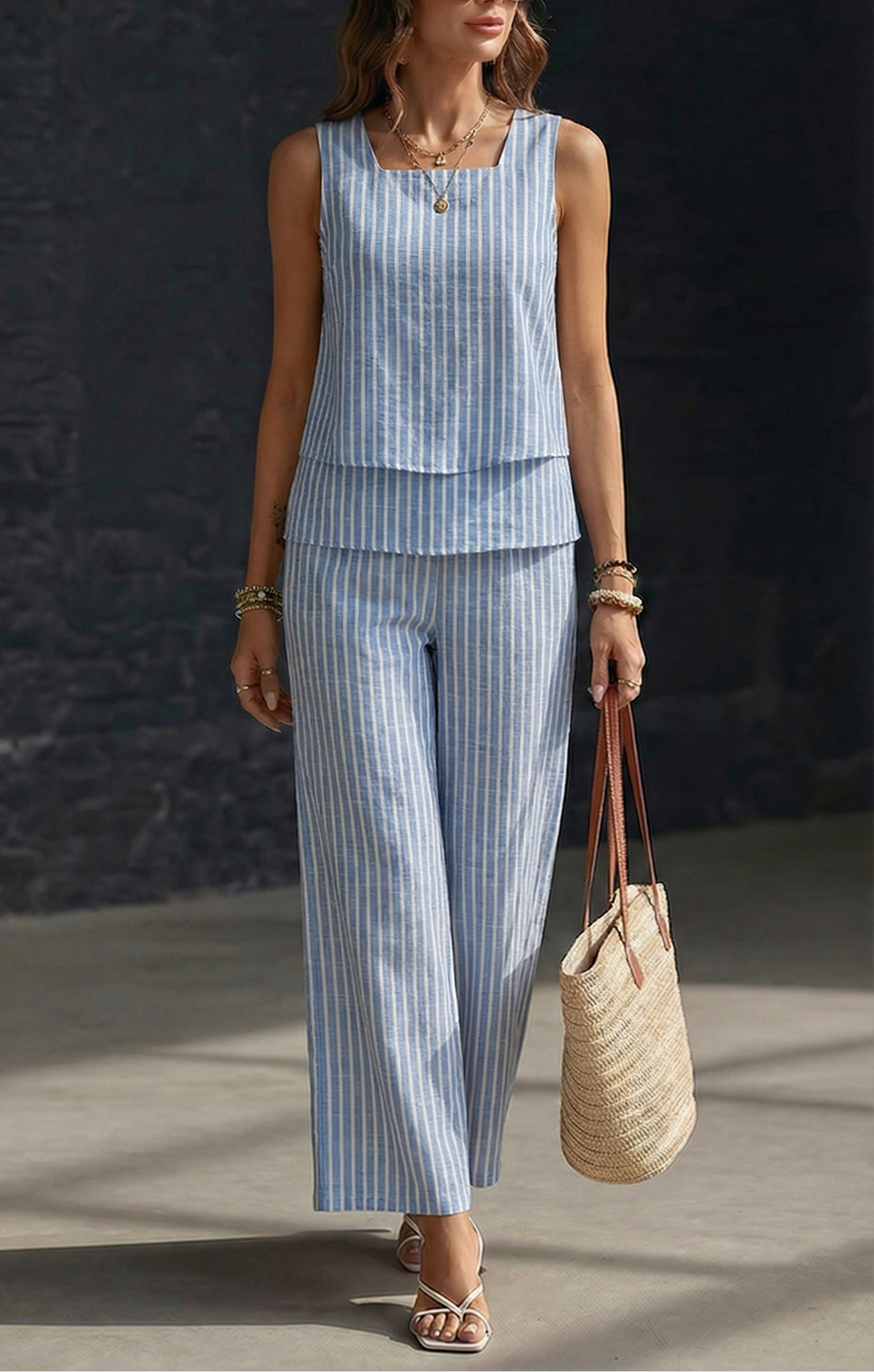 Entrez dans l'élégance estivale sans effort avec l'Ensemble Estival Élégant Averie. Conçu pour vous garder fraîche et à la mode, cet ensemble offre la combinaison parfaite d'un haut ample et de pantalons larges, idéal pour chaque occasion durant la chaleur.