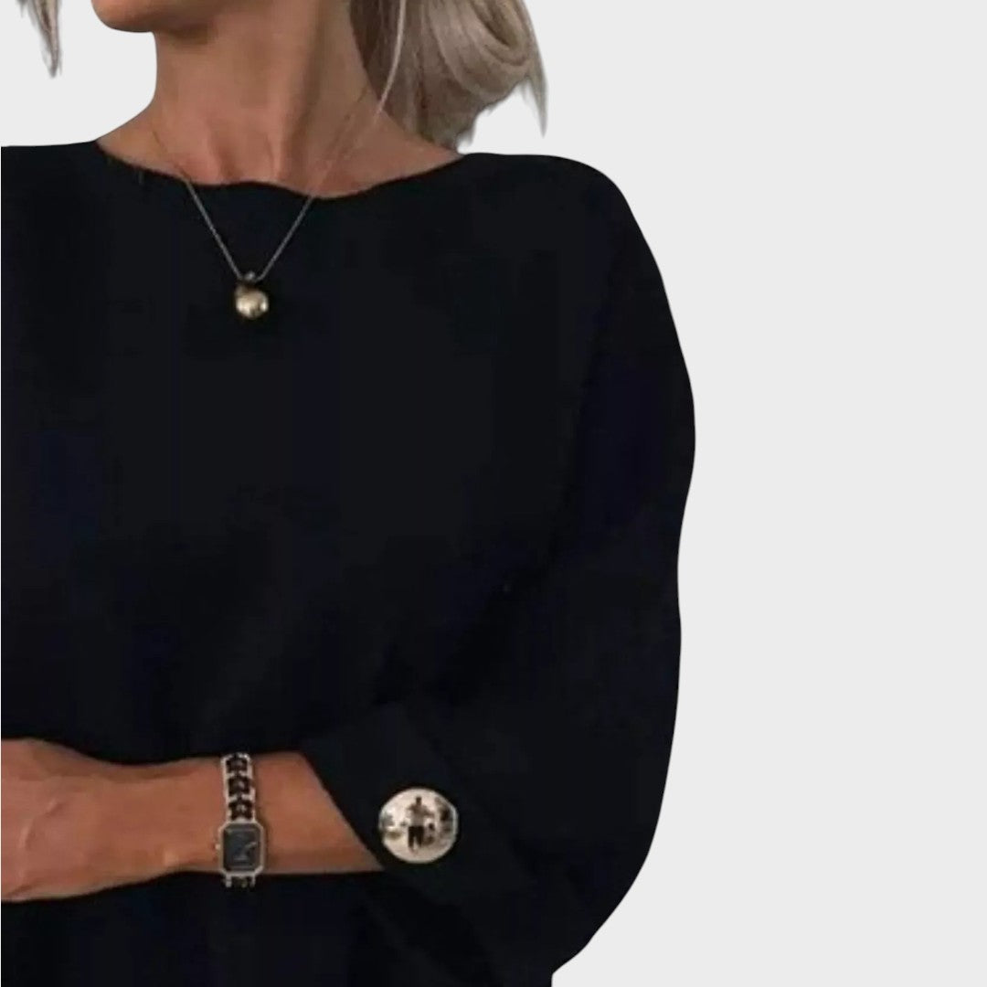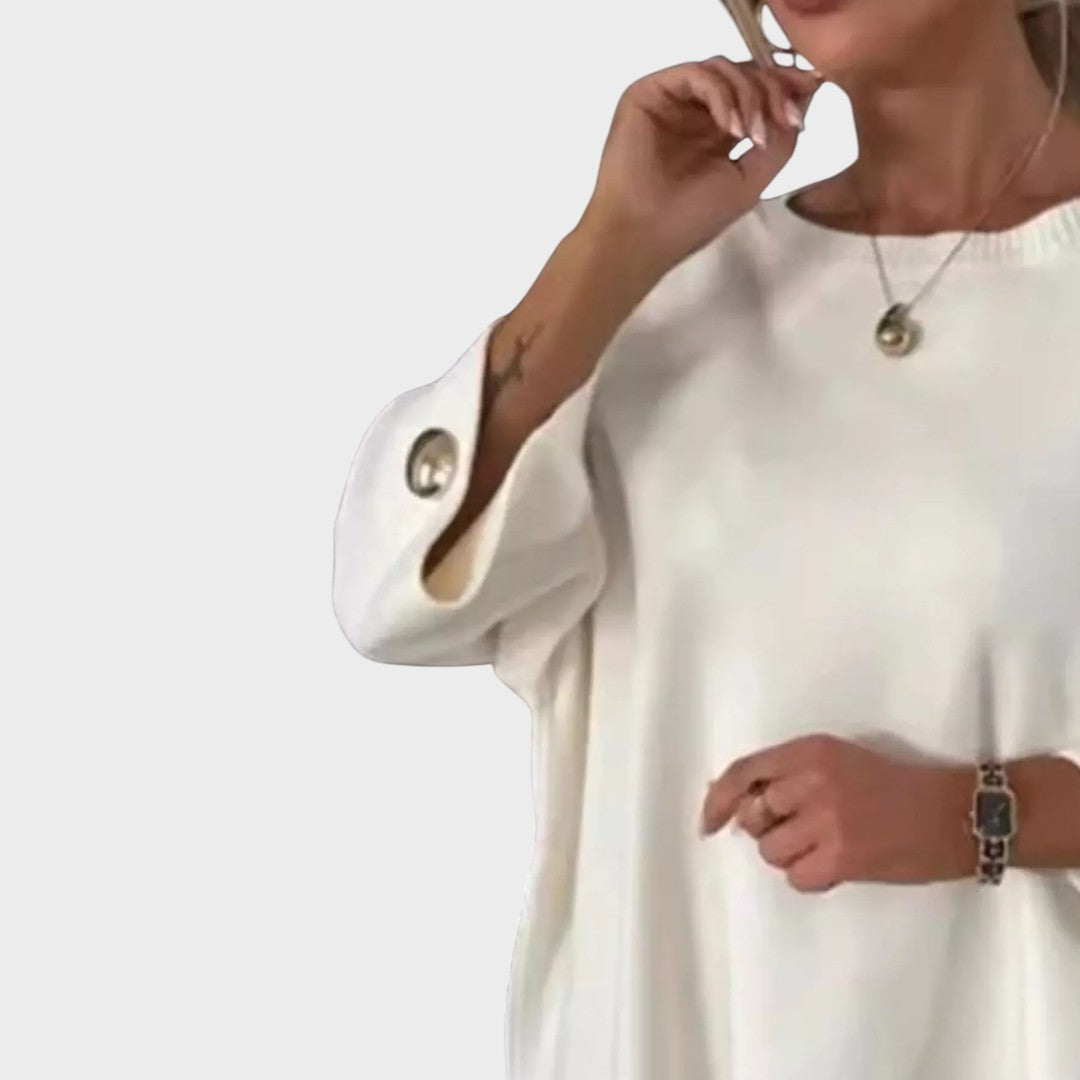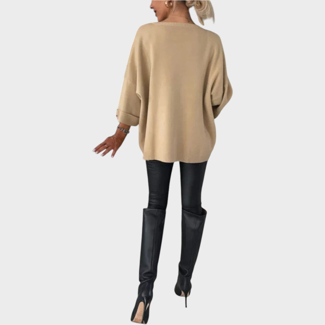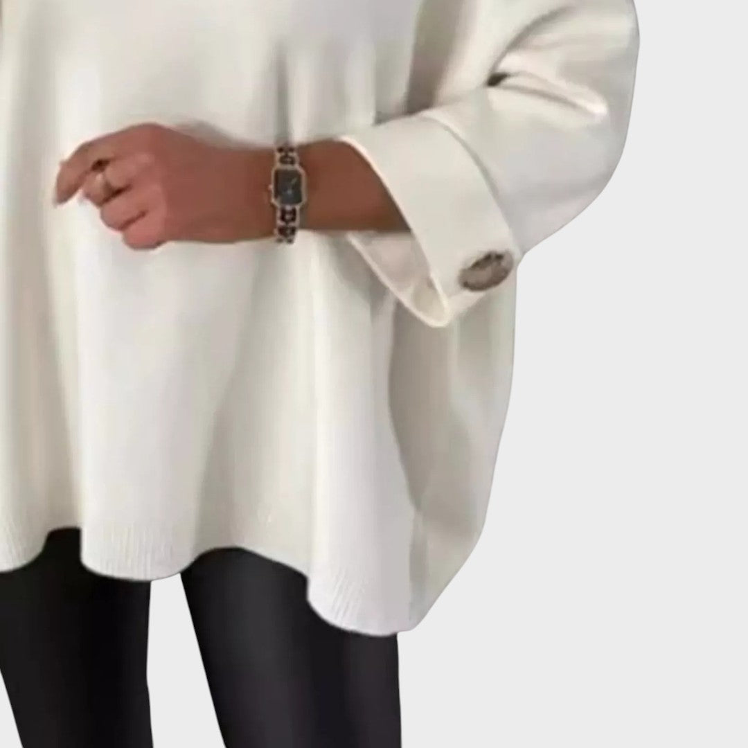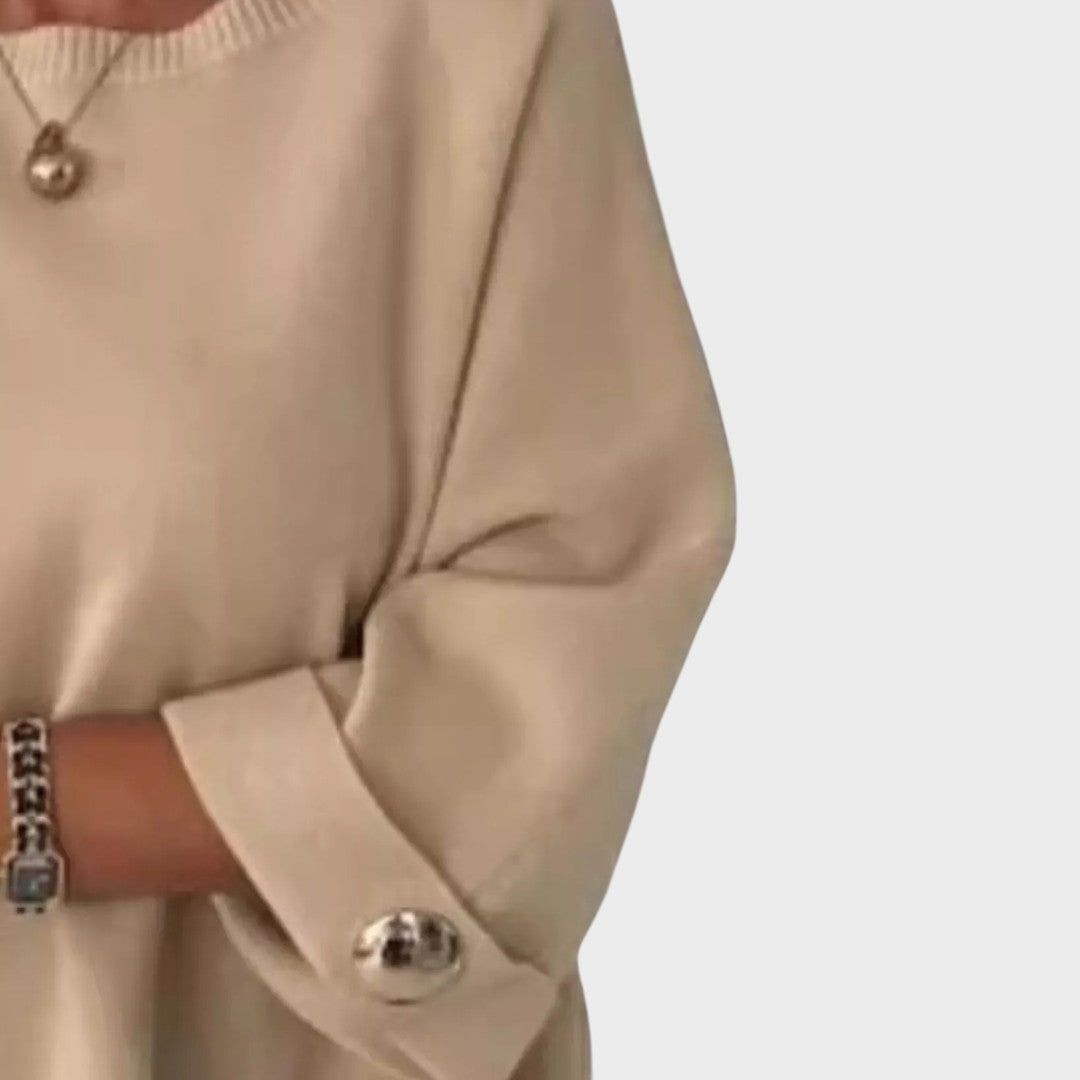 Le pull Adélaïde est la définition de l'élégance simple et du confort moderne. Avec une coupe ample et fluide, il se distingue par son design minimaliste et ses détails raffinés aux poignets avec des boutons décoratifs, apportant une touche sophistiquée au look.